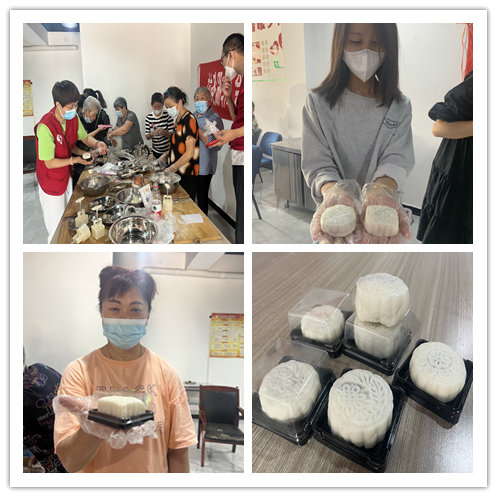 活动现场的居民和志愿者们很快便领会了制作窍门,大家围在一起有说有笑做月饼,互相分享着自己的经验,有的揉冰皮、包馅,有的压模、分装,现场分工明确、配合默契,还有志愿者高兴的唱起歌来,好不热闹。随着活动的进行,一个个独具特色的冰皮月饼相继制作完成,大家一边品尝月饼,一边说中秋节的趣事,营造出浓厚的节日氛围。