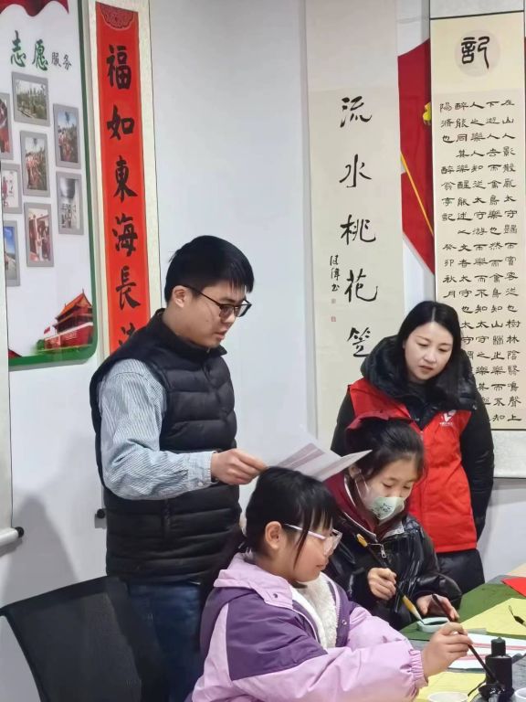 “把纸放平,是学书法的基本功”,社工协助书法老师教授小朋友们正确的握笔姿势、笔画顺序以及书写技巧,向小朋友们介绍新年“福”字的含义和价值:在书法中“福”的左边像个人,右边像盛酒的器皿,“福”字就有了祭祀祈福的意义。此番解读让小朋友们感受到了中国汉字的历史文化底蕴。