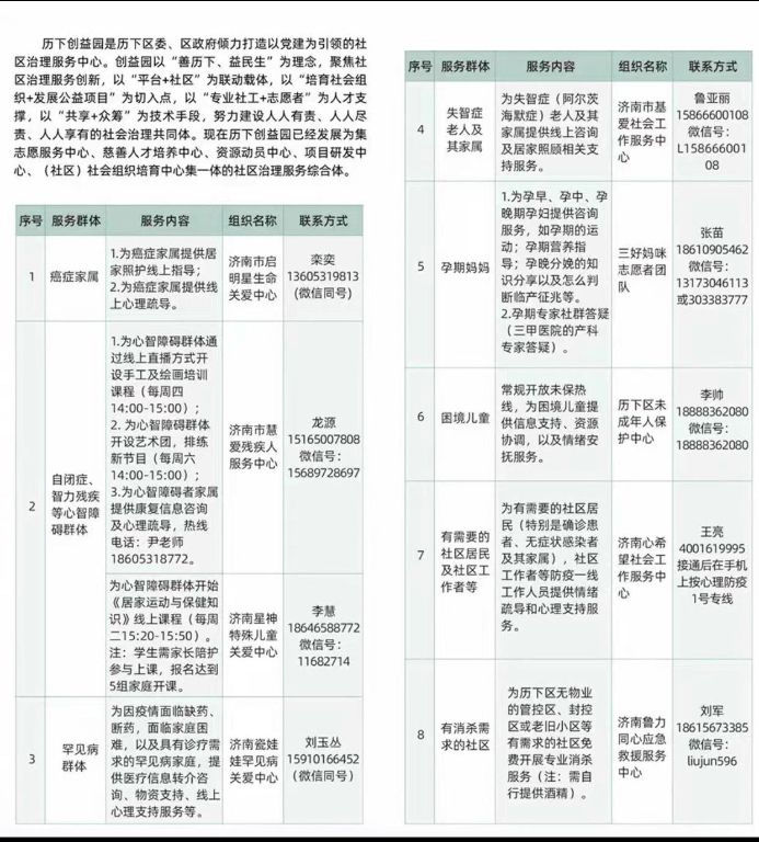 为有效阻断疫情传播,尽快实现“动态清零”,社区防控作为疫情防控的第一道防线,也是各项防控措施落实的最基本的单元,被摆在了重要的优先位置。疫情之下,部分社区面临封控,除了要满足大部分社区居民、酒店住户的基本需求,社区内独居、失能老人、孕产妇、残疾人等特殊群体的特殊需求更需要得到有效和及时回应。2022年5月7日,大明湖街道社工站开展“疫情之下 守护社区”历下公益服务进社区走访宣传活动,将历下区民政局、历下创益园、历下善治印发的《守护社区,疫情期间历下创益园持续为您服务》宣传折页送至六个社区,并进行讲解宣传。面向社区中的心智障碍者、孕妇、癌症家庭、罕见病家庭、失智老人等弱势群体,历下创益园的社会组织充分发挥自身组织优势和专业优势,开启“线上抗疫”模式开展精细化、专业化服务。