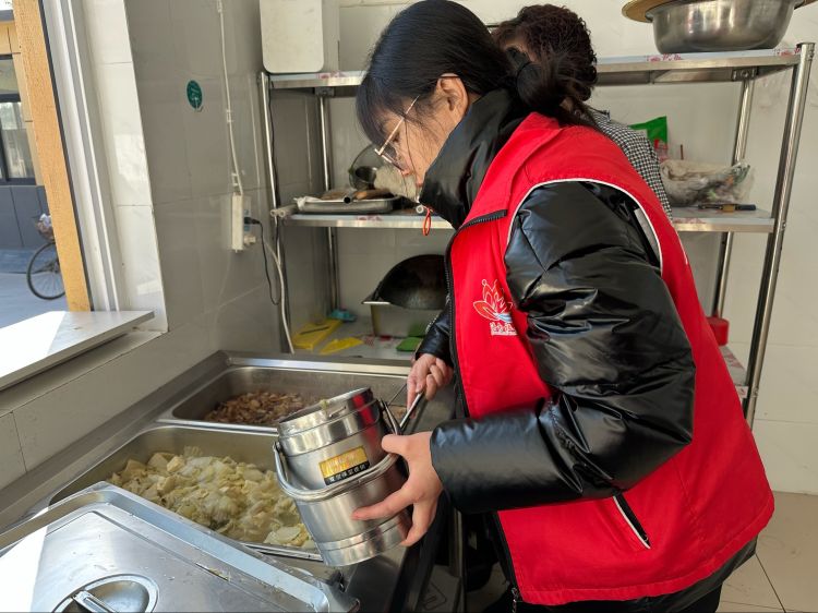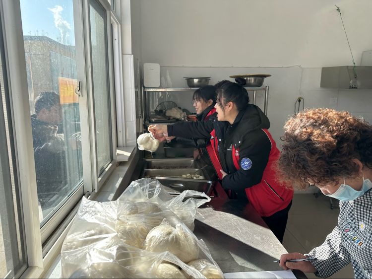 活动当天,社工们早早的就来到管家河村幸福院,帮助厨师大爷和大姐们摘菜洗菜分装馒头等系列工作,随后老人们也陆陆续续来到幸福院等待领取餐食,社工们细心地引导老人就坐、等待,随后向老人分发餐食,并做好领取记录工作。