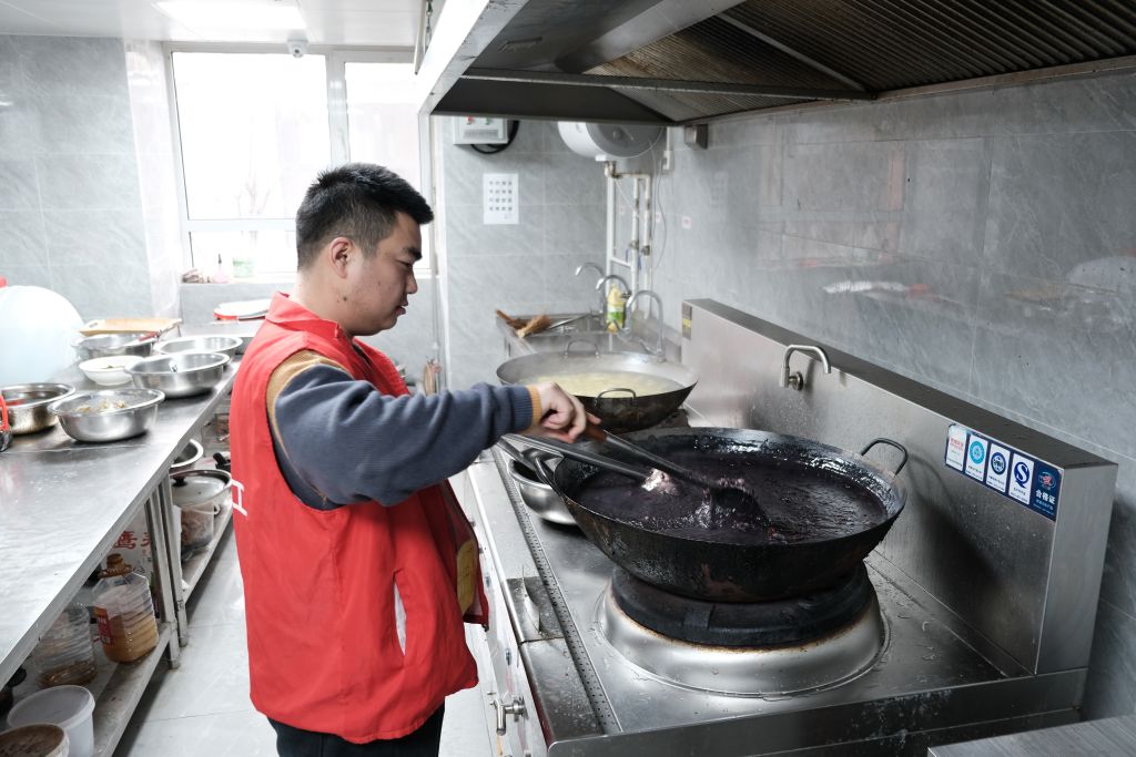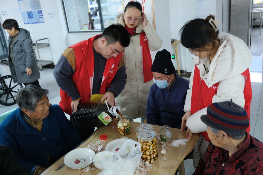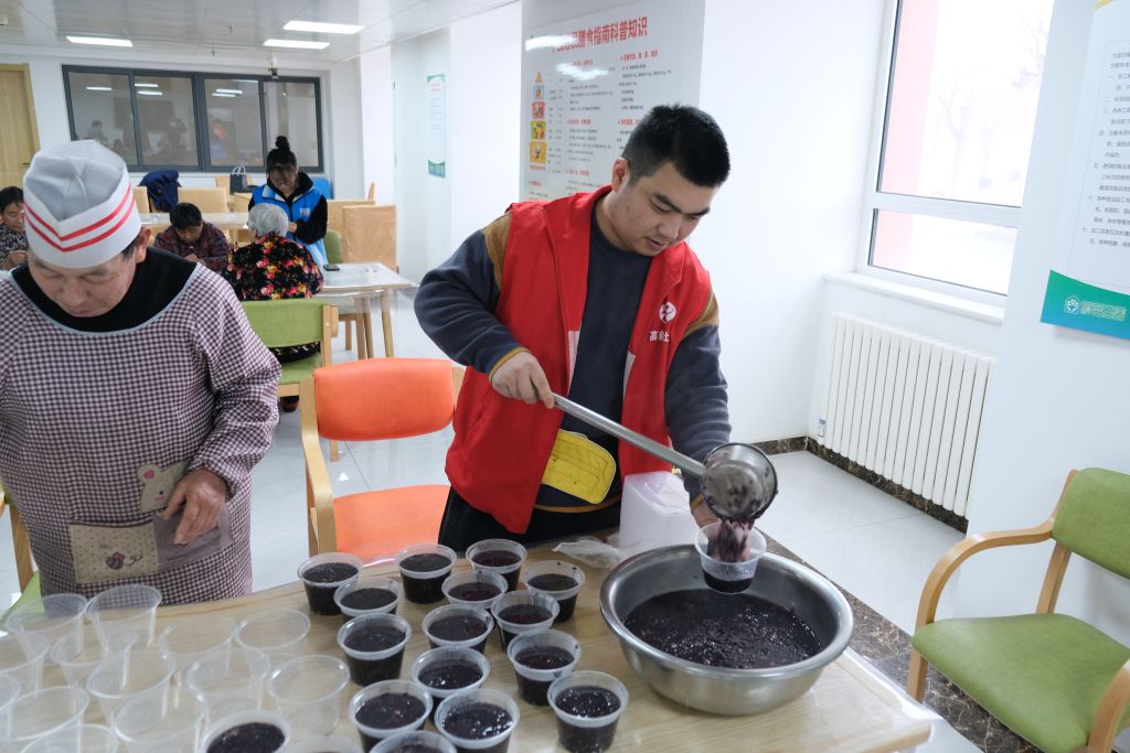 社工和志愿者们早早来到养老院,将红枣、桂圆、莲子、花生等食材一一洗净,进行熬煮。待老人们陆续来到餐厅后,一碗碗热气腾腾的腊八粥端到老人们的面前,大家一边分享美味的腊八粥,一边分享自己的往事。