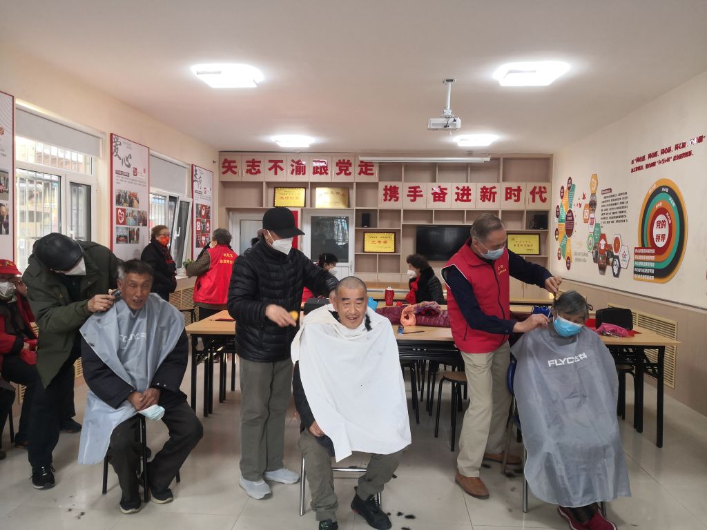 社工和助残帮扶志愿者们到达现场准备好理发工具,即刻进入了工作状态。社工引导前来理发的老年人签到就坐,理发师志愿者细心地为每一位老年人修剪头发。在服务对象等待期间,社工与志愿者们与其攀谈,了解近期的身体状况,一起为恢复了生机的幸福社区喜笑颜开。修剪完毕,社工向老年人送上新年祝福。