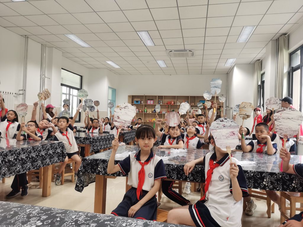 活动伊始,社工人员首先向孩子们详细介绍了漆扇的历史背景和文化内涵。通过讲解,孩子们对漆扇有了初步的了解,并对这一传统手工艺产生了浓厚的兴趣。后由志愿者向孩子们分发团扇,引导儿童按小组进行漆扇制作,孩子们将喜欢的彩漆滴入水中,运用点、甩、弹、划等多种手法在水面上呈现出精美的图案,再将扇子浸入水中,不一会儿,一幅幅独具个性的漆扇便成形,每个孩子的作品都是独一无二的,大家纷纷被传统非遗技术所震撼。