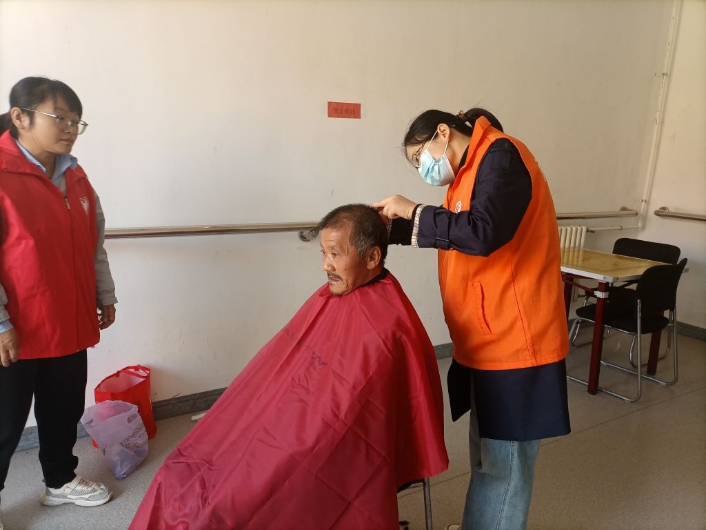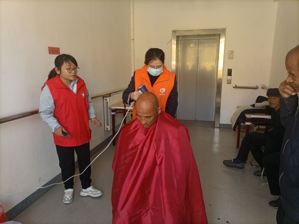 “大爷,您想剪什么样的发型?”敬老院中,社工化身“理发师”,摆好小方凳,手持理发工具,耐心的向老人们询问对理发的要求。