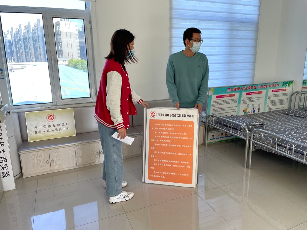 在本次评估中,评估人员重点检查了休息室、阅览室、活动场地、助餐情况、指示牌、各类档案等。社工全程陪同,并讲解运营及设施设备使用情况。接下来几天,社工将继续配合各日间照料中心负责人进行市局评估检查。