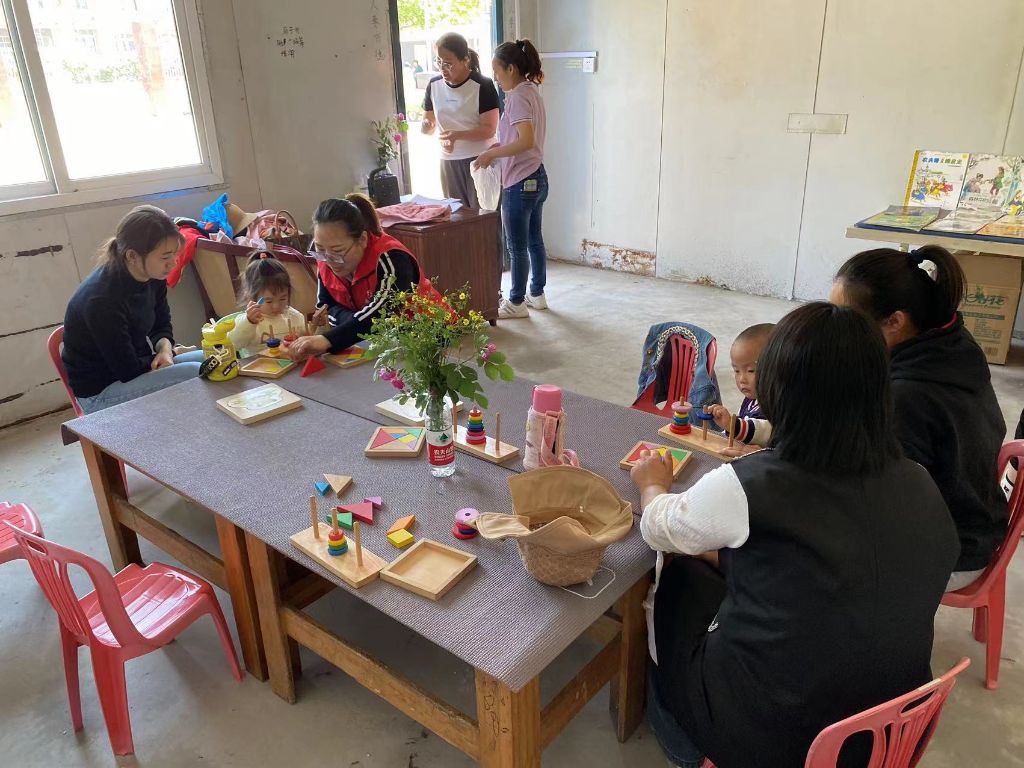 活动中,志愿者老师带领儿童一起玩木制叠叠圈积木和七巧板等益智玩具,为儿童讲解了图形的颜色和形状,以及七巧板的摆拼方法,每个孩子都在认真拼搭自己手中的积木。