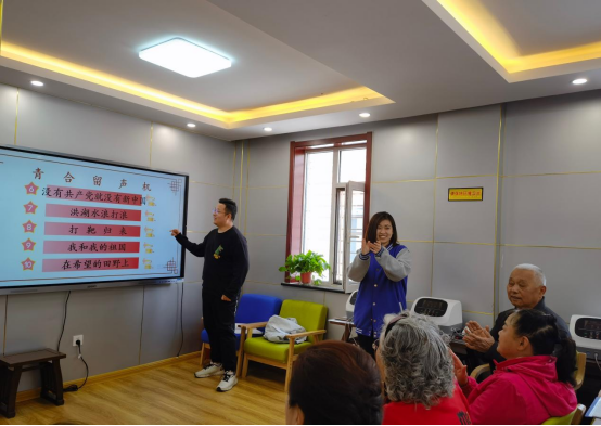 开课伊始,青合站社工首先采取了“红歌九宫格”的方式进行破冰游戏,参与活动的党员群众通过红歌歌词抽签的方式进行现场组队,成功接唱出红色歌曲其中一段的一组队伍视为胜出,率先将九宫格连成一条直线的队伍将成为本次课堂活动的首次获胜队伍。当青合留声机内传来《我和我的祖国》、《东方红》、《没有共产党就没有新中国》、《在希望的田野上》等歌曲时,阵阵铿锵有力的歌声萦绕在大家耳畔。