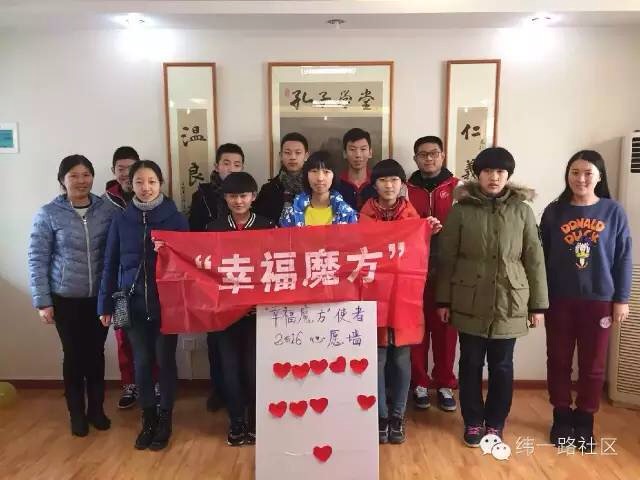 近日,大观园街道纬一路社区“幸福魔方”社工项目组,开展冬令营之“小志愿者的新梦想”活动。本次活动共有二十七中学初二、初三15位小志愿者参加,在“‘幸福魔方'使者2016心愿墙”上写下自己的新年梦想。