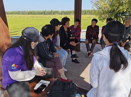 社工快走到村口便看到稻花亭里人头攒动,隔着二十多米的距离,亭里晒太阳的阿姨们一眼就把社工们认了出来,“你们又来啦!”、“快坐下歇歇!”。