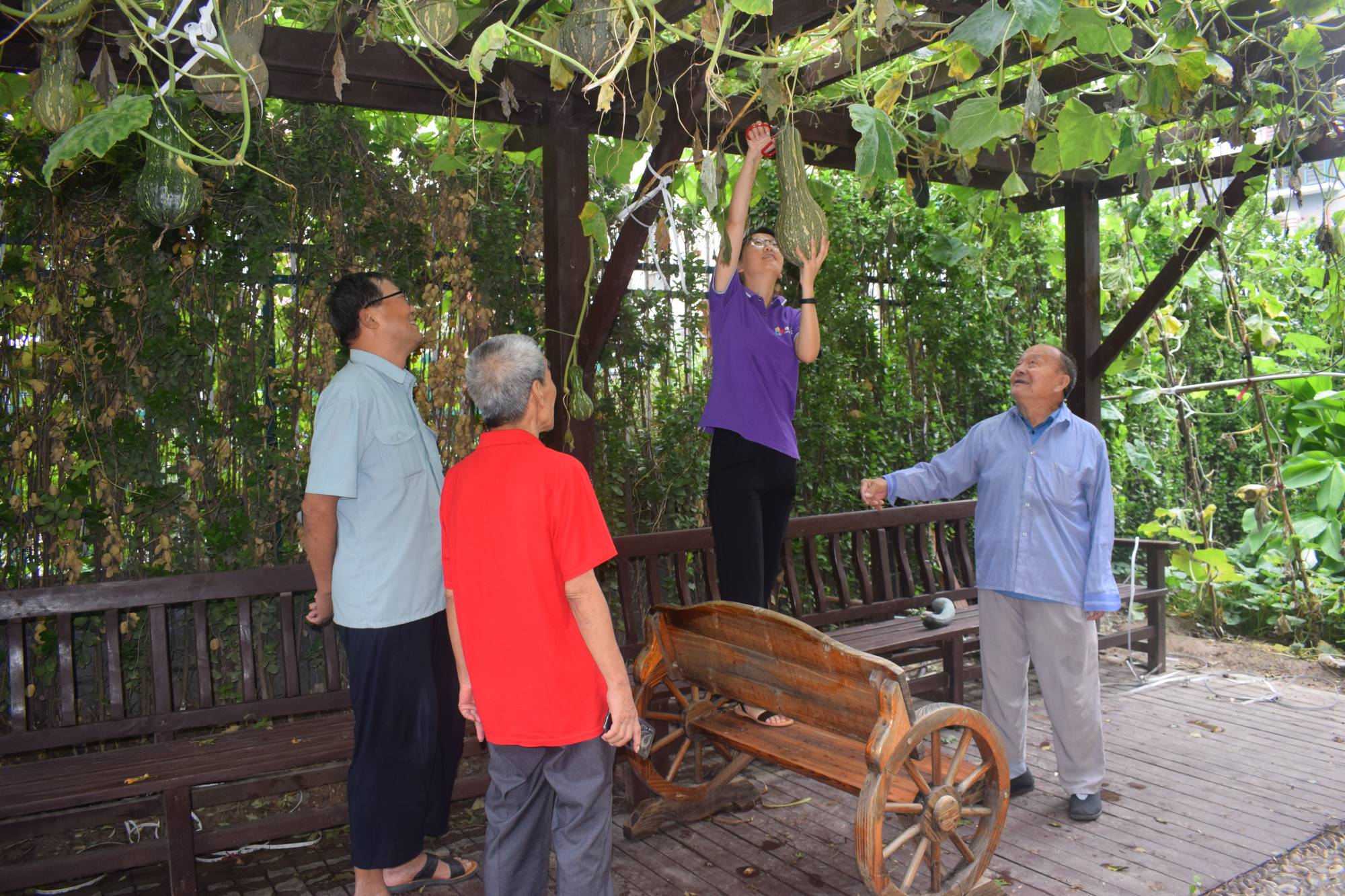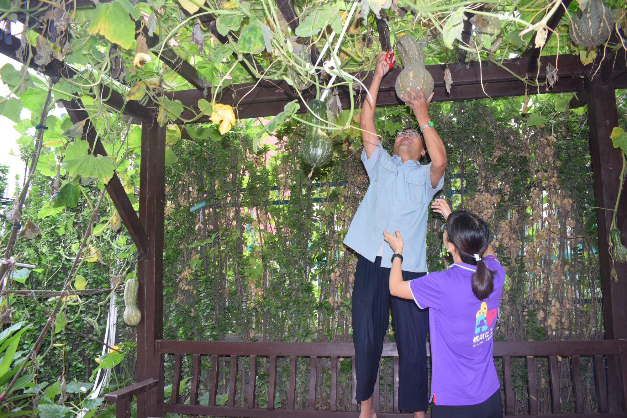 经过激烈台风的洗礼,南瓜藤愈发清润,一个个熟透了的南瓜等着人采摘。老人持剪,社工接应,南瓜被送上蒸笼,静待老人们品尝收获的喜悦与欣慰。经过四个月的朝夕相处,南瓜小组的成员们感情日渐深厚,在廊下经常能听到他们爽朗的笑声。