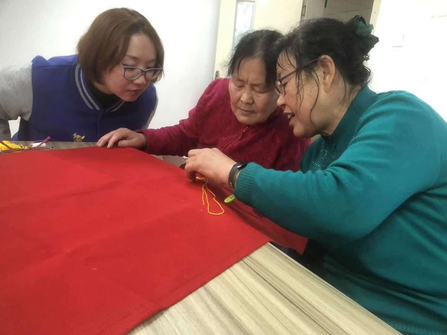 社工在活动前两天通过微信和电话召集社区居民们参与此次活动,得到了居民们的热烈回应,同时我们还邀请了张庄路街道综合养老服务中心的孙院长与王主任一同参与。活动当天下起了淅淅沥沥的小雨,冲刷着新生的绿芽,空气中烟雨蒙蒙,渗透着丝丝凉意。而阿姨们早早到达社工站,他们对社工说:“正是因为在党的领导下,才能过上如今的好生活,一定要亲手表达自己的一份敬意。”我们深知老一辈人对党的忠诚、热爱和崇高的信仰,我们也怀着新时代年轻人昂扬的斗志和饱满的热情,将这份感情融进一针一线,绣制成这面献给党的礼物。