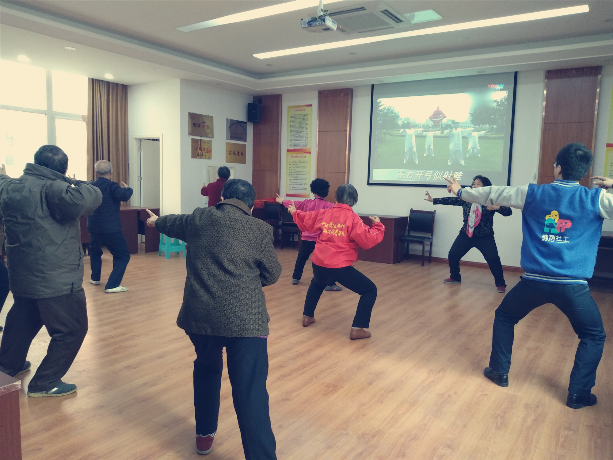 活动开始,社工小姜首先感谢各位老师的长期坚持一路陪伴,并向大家介绍了本次活动的流程。在“快乐分享”环节中,志愿者王老师反映,“现在天气越来越暖和,居民都愿意出门活动,我们何不把队伍拉出去,让更多的居民参与进来…”其他成员纷纷复议赞成,徐老师说“到时候还可以把自己的老伴带着,虽然她不能站起来跟着大家一起活动锻炼,可以让老伴在一旁看着我们大家一起活动,让她也高兴高兴…”随后,社工小姜和成员一起商量下节课户外活动的人员场地安排的相关事宜。最后由志愿者王老师带着大家跟着视频练习健身养生操“八段锦”“太极拳”。