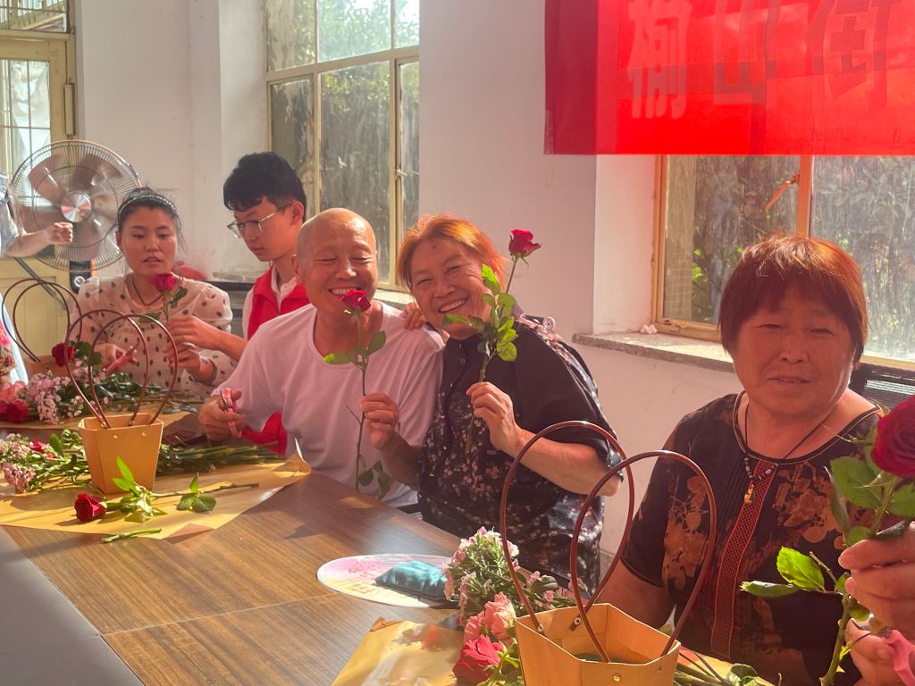 活动现场花香扑鼻,在社工和志愿者的帮助下,一束束充满爱意的花束相继诞生,老人们高兴地唱起了歌,鲜花映衬下的老年人笑脸灿烂,岁月安好。