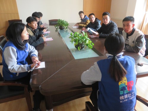 山东交通学院青年志愿者联合会为项目组自主链接资源,在前期相互了解的基础上,双方建立了良好的联系。在青志联新学期纳新换届之后,主要负责人与项目组及时取得联系,就新一批的志愿者工作展开交流。此次会议中,社工与志愿者方针对志愿服务时间、项目组活动安排、志愿者参与人数等系列问题进行了交流与沟通,敲定志愿服务计划。活动最后,社工带领志愿者熟悉了活动场地,并参与了正在开展的活动,从而为接下来的志愿服务工作奠定基础。