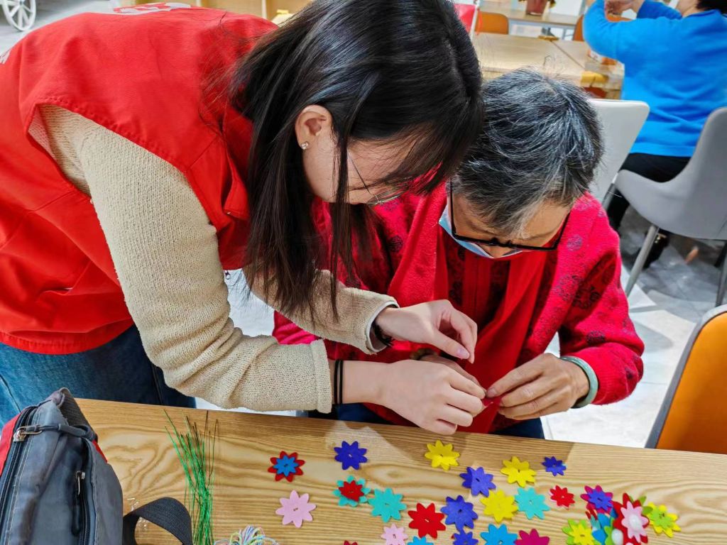 活动伊始,社工首先详细解释了本次活动的主要内容以及在手工制作过程中需要注意的地方。接着,社工将手工制作的材料分发给每位老人,然后由社工协助老人们亲自完成自己的作品。在拿到所需材料之后,阿姨和奶奶们纷纷投入到制作自己的纽扣花束的过程中,用五颜六色的纽扣“织树”,他们有的两三个人一起合作,互相讨论,有的独立完成,而社工则在附近指导、示范,大家都忙得不亦乐乎,对于那些对手工艺充满热情但又有为难情绪的老年人,社工会采用激励的方法,引导他们一步一步的完成花朵,让其体验到成功的乐趣。在制作过程中,老人们还分享各自身边发生的有趣事,最终,在社工和其他参与者的帮助之下,每个人都迅速地完成了他们的创作,当看到自己最后的成品时,大家也都感到无比的欣喜。