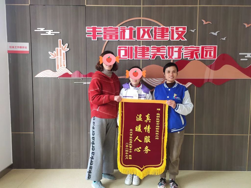 3月27日,西市场街道社工站收到了北大寺社区居民曹女士携其女(化名:元元)送来的一面锦旗,以对社工表达几个月来无微不至的帮助和陪伴的感谢,元元笑呵呵的与社工打招呼。“真情服务,温暖人心”短短八字但情意满满。