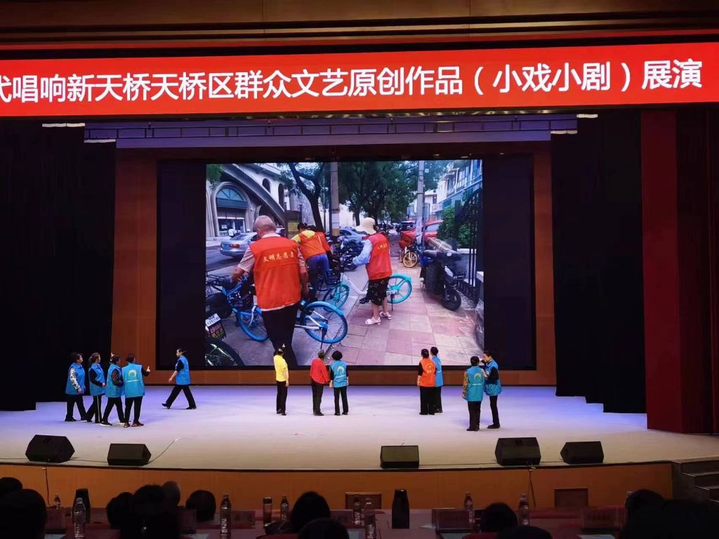 伴随着音舞快板《二十大精神铸辉煌》欢快的节奏,此次群众文艺原创作品展演活动正式拉开序幕。我们天东的“舞动天东舞蹈队”第五个节目出场,为现场观众带来原创舞台剧《美丽在天东》。剧中以天桥东街社区志愿者为原型,把志愿服务中的真人真事以舞台剧的形式呈现给大家。剧中,列举了创城、疫情防控等志愿者服务活动,引起观众广泛共鸣。把社区工作中遇到的问题和大众的不理解展现出来,通过舞台剧的方式,让更多人能够了解社区工作,架起一座沟通的桥梁,让彼此更理解。