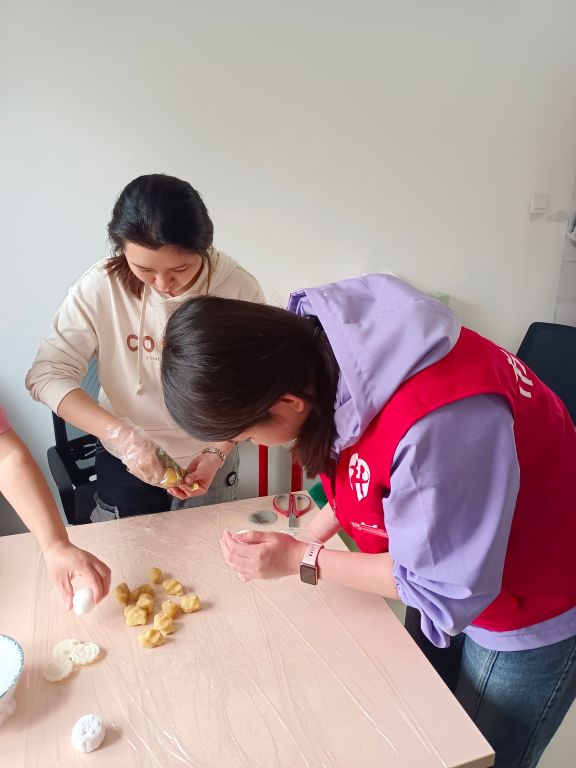 “先把面团压成饼皮,再把馅料包入饼皮内,揉成球,放进模具里压一压……”活动现场,社工为大家讲述了中秋节的来历及习俗,向大家介绍了制作月饼的技巧和步骤。随后大家一边探讨着做法,一边揉面团、包馅料、搓成团、压成型等,并挑选自己心仪的雕花模具,给月饼印上了带着美好祝愿的印花。