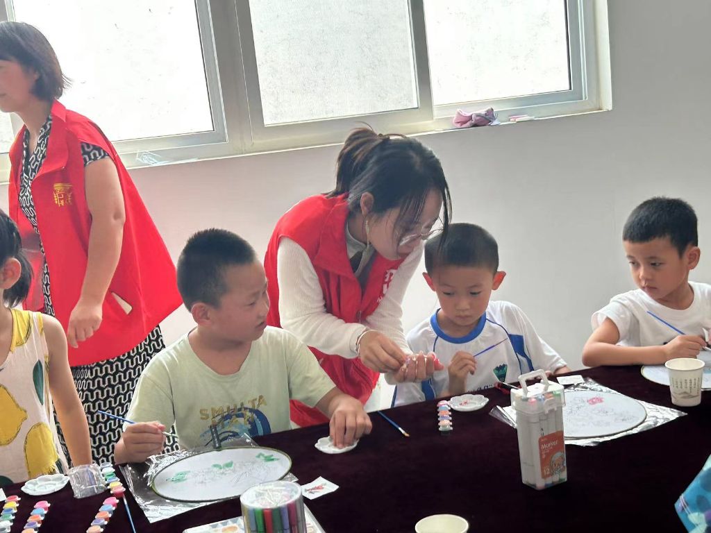 此次参加活动的对象为邢家洼村幼小衔接的儿童,活动开始,社工首先与小朋友们进行了良好的互动并向小朋友介绍到扇子不仅是夏日纳凉的工具,同时也承载着典雅与精致的文化内涵。社工带领小朋友们了解了团扇之后,开始教授孩子们分发各种图案的扇面、五彩的颜料和调色盘。活动中,社工鼓励孩子们充分发挥自己的想象力,通过图片的参考加自己的创新绘制成不一样的团扇。随后,社工邀请每位小朋友介绍自己所创作的作品的原因,通过“动手+动口”的方式,提升孩子们的创作能力和表达能力,为开学后孩子们能够更好地适应新环境奠定基础。