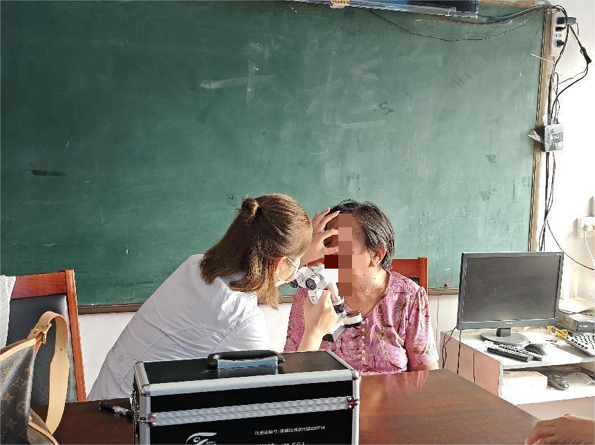村民到达现场后,社工引导进行登记,测视力,眼底检查等项目。医生根据检查结果给出专业建议和治疗方案。同时,社工和志愿者还向村民宣传眼部健康知识,提供健康咨询和指导。在检查过程中,社工得知村民王大妈患有白内障,需及时治疗,而子女不在身边,社工第一时间联系其子女,并协同医生一起沟通预约会诊时间。王大妈听到后,脸上也露出了幸福的笑容。