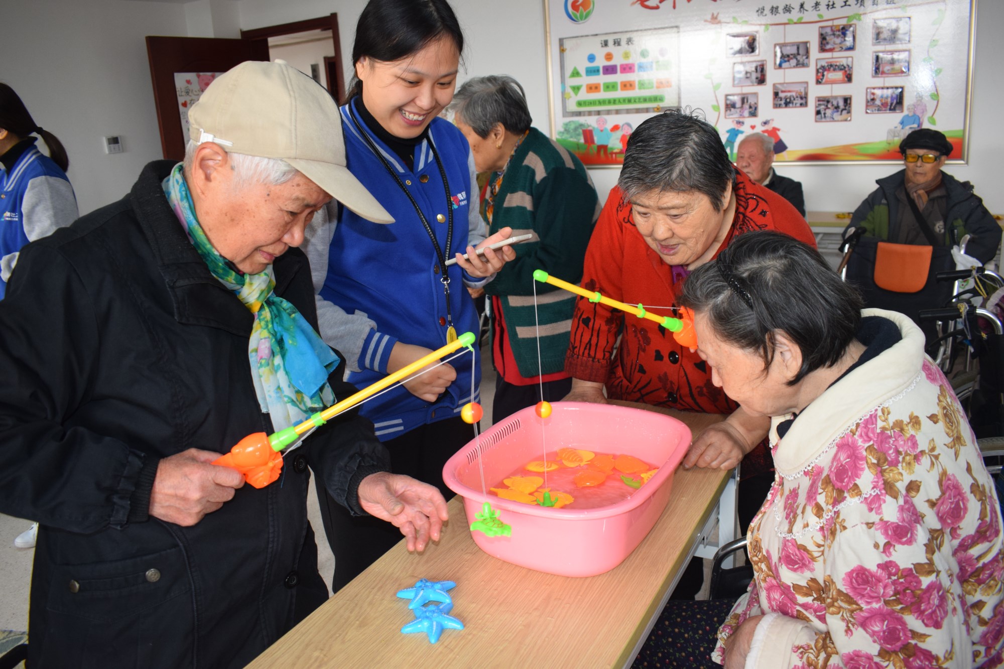 本次秋日运动会活动共分为三个环节。第一个环节为“心随手动”夹兵乓球,规则为老人用筷子将兵乓球从一个盆子运送到另一个盆子,在30秒之内运送乒乓球数量多的人胜出。第二个环节为“手眼协调”钓小鱼,在一分钟内钓出来的小鱼数量多的老人胜出。在第一环节和第二环节中胜出的老人可以分别获得一份小奖品,奖品虽小,但胜在心意。第三个环节为套“福禄”,社工把葫芦、水果摆放在地上,用套卷游戏的方式,每人五个不同颜色的圈,圈中的奖品当场领走。服务对象们踊跃参与,旁边的老人也在加油鼓劲,套中的老人拿着奖品高兴的像个孩子。赵奶奶说,“老人们在一起,热热闹闹,高高兴兴,这在住进养老院之前是根本想象不到的事情啊!”