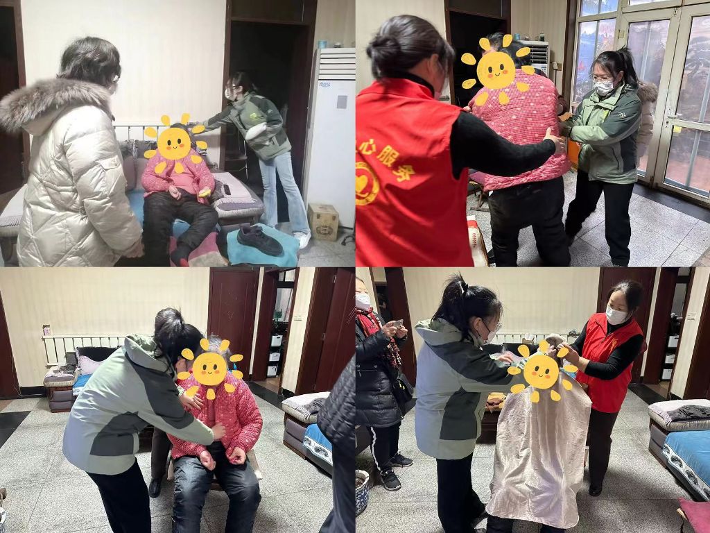 在剪发过程中,社工协助理发师稍怕有一点不慎造成对林老师不适,确保在有限的条件里为其提供最周到、最优质的修剪服务。随后,为林老师丈夫也修剪了头发。一张椅子、一把剪刀、一把梳子,理发师用灵巧的双手熟练操作,在冬日修剪出一幅幅温馨和谐的画面。