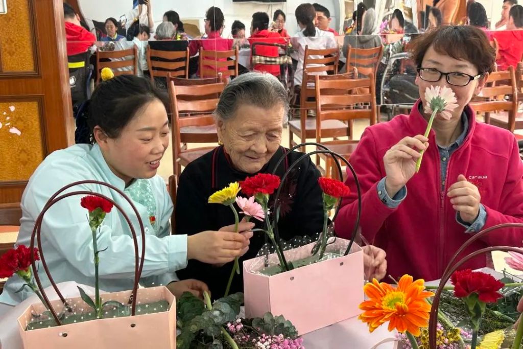 在活动现场,福利院社工整合院内院外资源,特意邀请了具有丰富经验的花艺师来教授大家花艺制作。花艺师详细讲解了花的排放顺序、处理花杆的手法,随后又演示了包花的手法技巧。在听了花艺师细致的花艺讲解后,参加活动的服务对象和志愿者们三五成群,自由组队,相互帮助,充分发挥自己的想象力和创造力,把康乃馨、满天星等各种花搭配在一起,一边研究一边创作,现场欢声笑语,花香四溢。