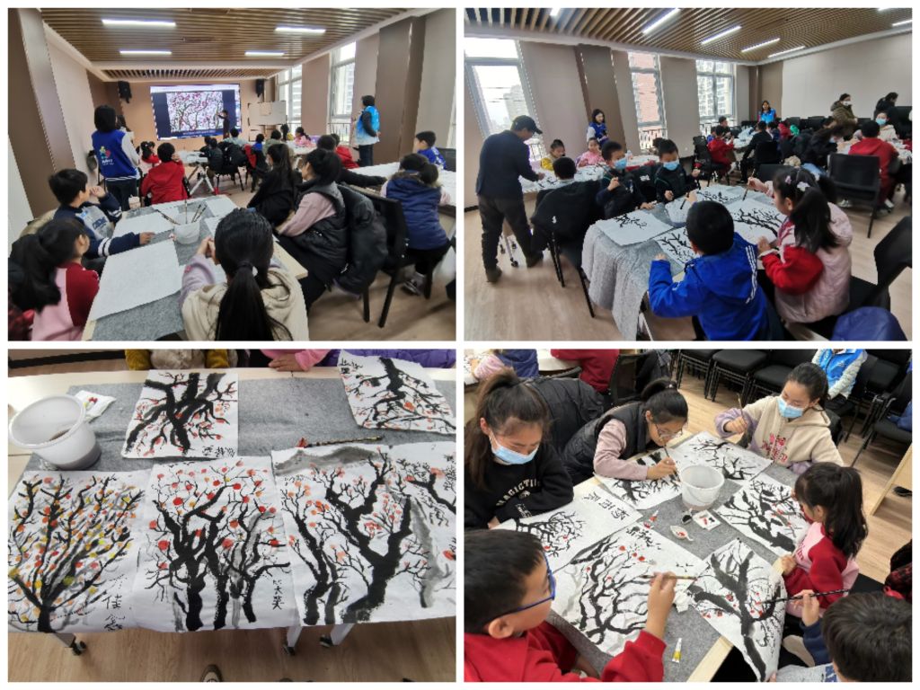 本次冬令营活动中传统文化服务版块,是由南辛庄街道社工站联合欣园社区通过整合社区资源邀请到贝壳教育机构专业美术老师教授青少年用毛笔绘画。“树木是山水画的主要景物之一,树木通常分为枝干、根系和树叶三个部份,根系有时可不画,但枝干和树叶是必画的,且要注意树有伸枝,要敢于将树枝伸出去,不要缩成一团,画的时候大家要大胆的去画,没有画对,画错的说法,只要注意点、线,笔锋粗细的均匀掌握就可以了”。活动中老师耐心的给组员们讲解着专业绘画技巧,同时借助ppt展示柿子树画法的方式,让组员们一边观察一边临摹,随后在老师、社工及社区工作人员的引导下,组员们认真的进行绘画,有的组员按照老师的教授用散锋破笔勾画树干,注意行笔的转换,散锋点叶的灵动老干加明暗,以刻画质感、体积感;有的在画前后树枝时很注意树干之间的呼应,在浓淡、粗细、疏密及枝条的穿插时,注重行笔宜中、偏锋共用,以使树木丰富变换,产生线条美,收尾再通过调色勾勒柿子的图案、给画上色。最后一张张活灵活现的柿子树,一个个挂满树枝的柿子跃然纸上,红彤彤的令人垂涎欲滴,完美呈现出了“‘柿柿’如意”图案。