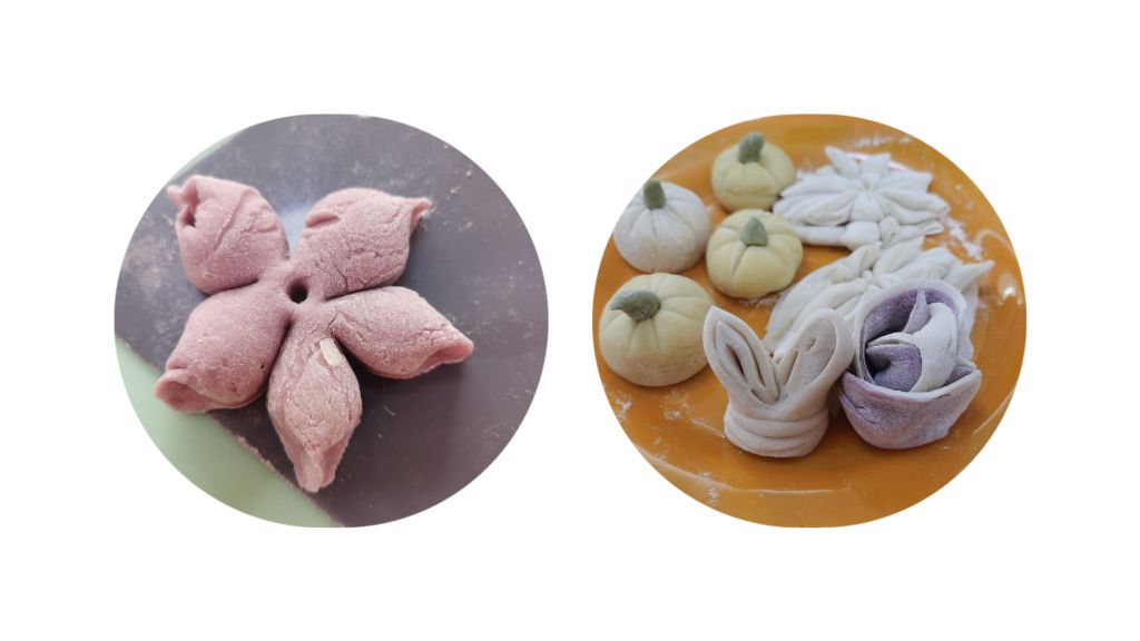 大家围在一起,听面点师介绍面点的工艺流程以及花样面点的制作技巧。面点师拿出了用菠菜汁和好的绿面、紫薯汁和好的雪青面和南瓜汁和好的黄面,演示了做玫瑰样式和南瓜样式的馒头。长者们看的很认真,觉得很有意思,迫不及待的想尝试自己制作。紧接着社工向每一位长者发放面团,随后大家各自拿上擀面杖开始上手操作,揉面、擀皮、做花样。制作过程中,长者们互相交流学习,分享经验,很快一个个成品就完成了。