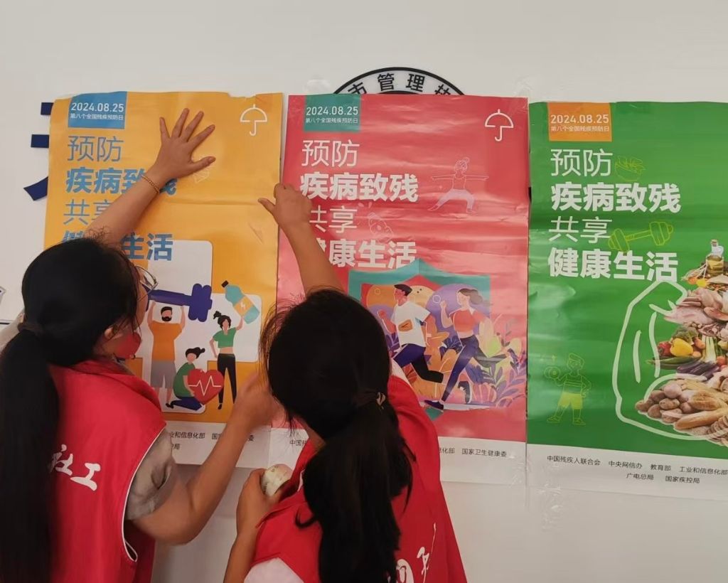 社工在辖区内广泛张贴残疾预防日海报,一张张色彩鲜艳、内容丰富的海报被张贴在社区显眼位置,吸引了众多居民的目光。海报以生动形象的图文形式,向人们传达了健康生活方式对预防疾病致残的关键作用。此外,社工还向现场居民发放宣传资料,耐心讲解残疾预防的相关知识,涵盖了出生缺陷防控、疾病防控、意外伤害预防等多个方面,提醒居民在日常生活中注意防范可能导致残疾的风险因素。