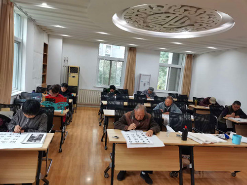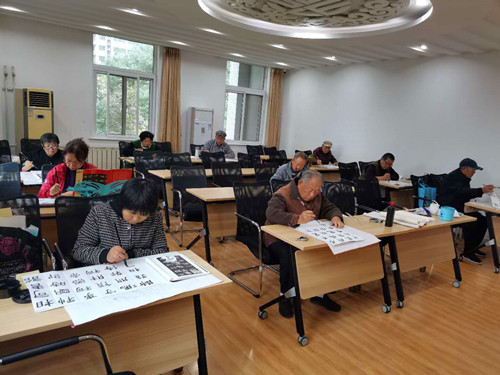 自己动手丰衣足食。下午来的较早的组员也是小组内积极分子,到达活动现场后,自己主动的为小组准备毛笔洗漱水、摆放墨蝶、分发宣纸.....“咱们这是一个互助交流练习书法的小组活动,能自己干的,尽量别麻烦社工”,组员籍阿姨和王阿姨一边做着书写前准备一边交流。等到组员到齐简单的寒暄过后,各自选择舒适的位置,开始了今天的书写活动,组员们练习书法的过程,不仅需要时间,更需要耐心、细致、用心,只有这样,雪白的宣纸在组员的笔端下才能鲜活起来。整个书写过程安闲自得,最后组员相互观摩、互动交流,体现了大家老有所乐的状态。