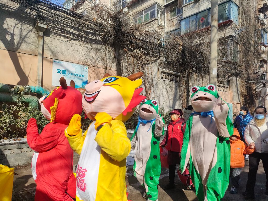 活动开始,秧歌腰鼓队的成员们打着铿锵的鼓点,彩绸欢舞;福娃闹春中憨态可掬的大头娃娃,诙谐逗趣,成为队伍中的焦点;网红玩偶、扇子舞、划旱船、舞祥龙等,热热闹闹的表演队伍走过大街小巷,将红红火火的节日喜气送给现场群众。