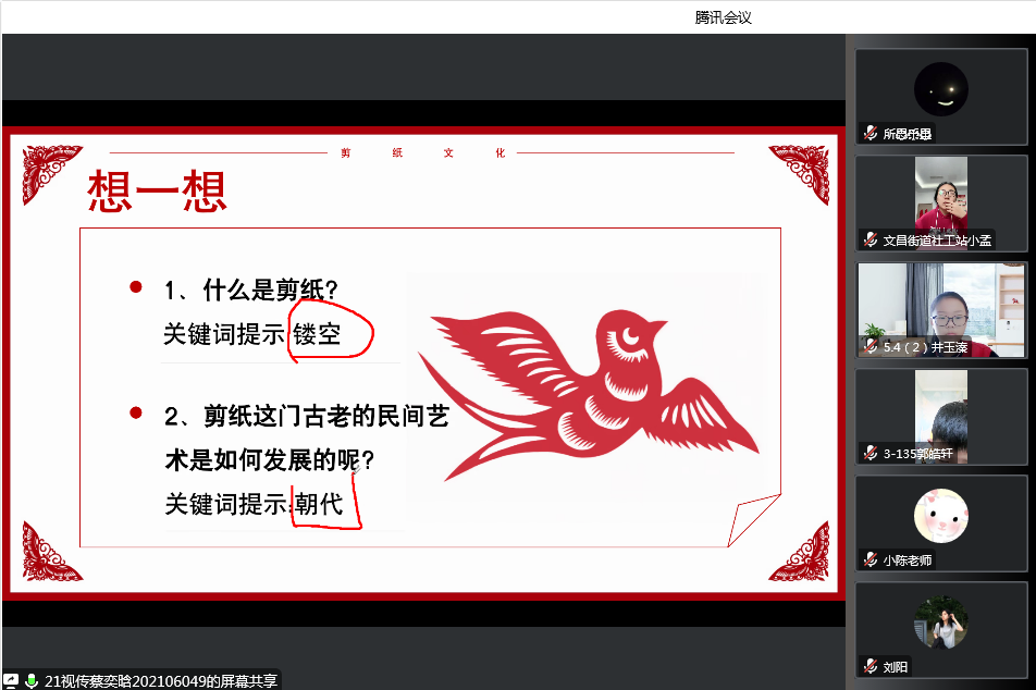 春节将至,现在大家都在为迎接传统节日的到来做准备,为更好契合节日主题,第一期的小组活动是民俗剪纸小组活动,一共将会进行五期,,开营仪式中站点社工邀请山东艺术学院大学生志愿者共同参加,志愿者带领大家一起提前熟悉活动内容,了解了剪纸的由来、类型、用途等基础知识,通过播放动画等小朋友喜欢的方式,将他们带入情境中,体验民俗文化的魅力。