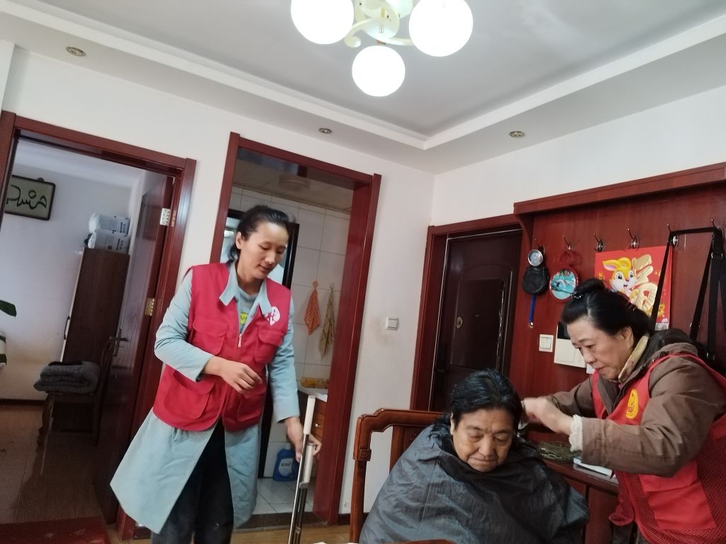 在活动中,社工了解到有位半失能老人行走出门十分不便,便带着志愿者入户上门为老人进行理发,老人家十分激动和开心,拉着社工和志愿者的手不住的表达着感谢。