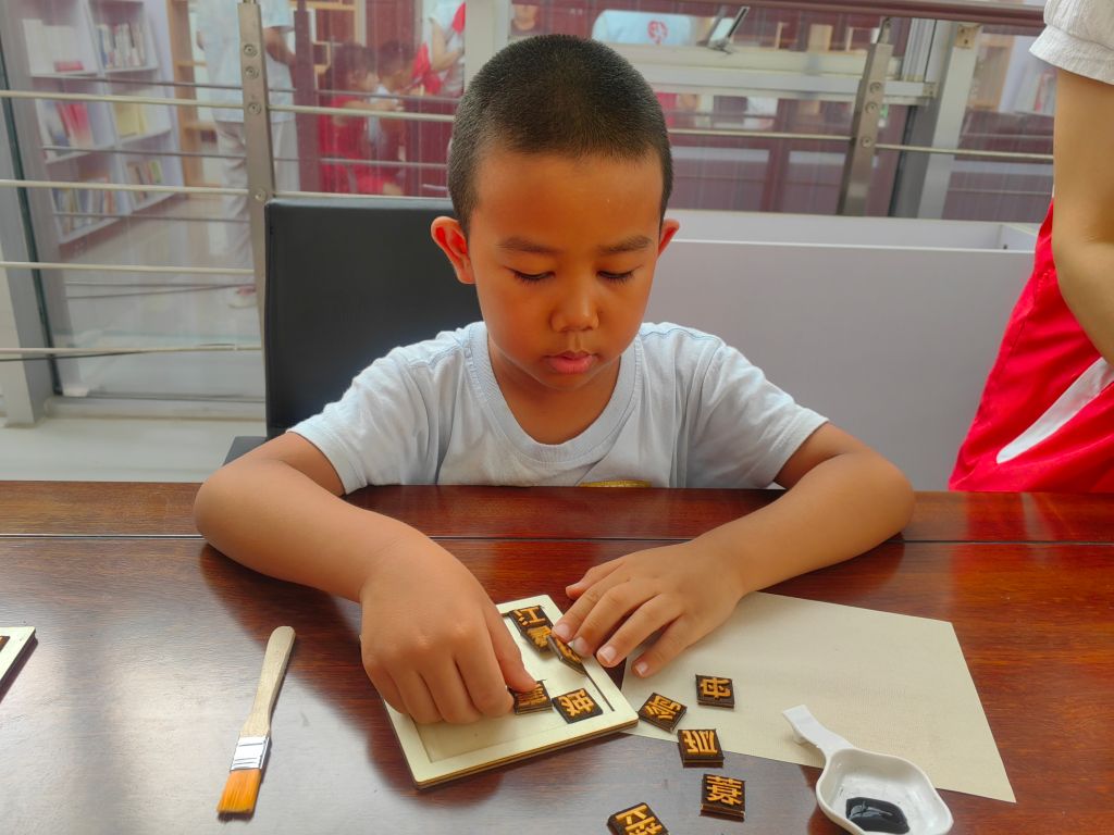 社工依次将材料分发给孩子们,在社工的指导下,小朋友们迫不及待动起手来,先将方块字按照诗歌顺序一一排版,再在排好的字上均匀刷上墨,然后将宣纸铺平拓印,最后轻轻将宣纸揭下来,一篇篇各具特色的古诗作品便清晰地拓印在宣纸上。从排版到上墨,再从上墨到铺纸印刷,最终揭纸成诗,看似简单的四步,却也需要孩子们的细致与耐心。当横平竖直的中国汉字,带着油墨的香气与纸墨相融,博大精深、意境悠远的东方神韵扑面而来。