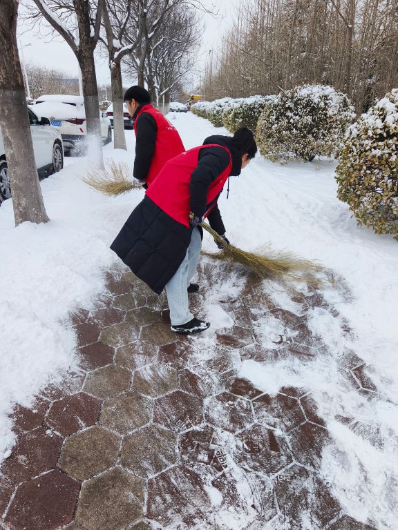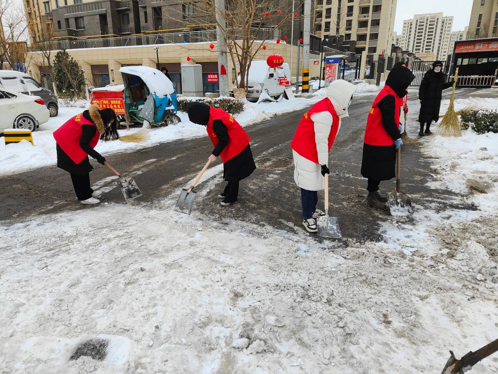 山水社区路面的积雪在出入车辆的反复碾压下,形成了坚实的冰层,铲除难度较大。双山街道社工站的社工们和志愿者们用铁锨将冰面敲碎,再用推雪铲将冰雪推到了一侧。虽然天气寒冷,社工和志愿者们的脸和手都冻得通红,但大家的热情丝毫没有受到影响,干劲十足,在铁锨与地面此起彼伏的摩擦声中,为群众开辟出一条条安全的道路。