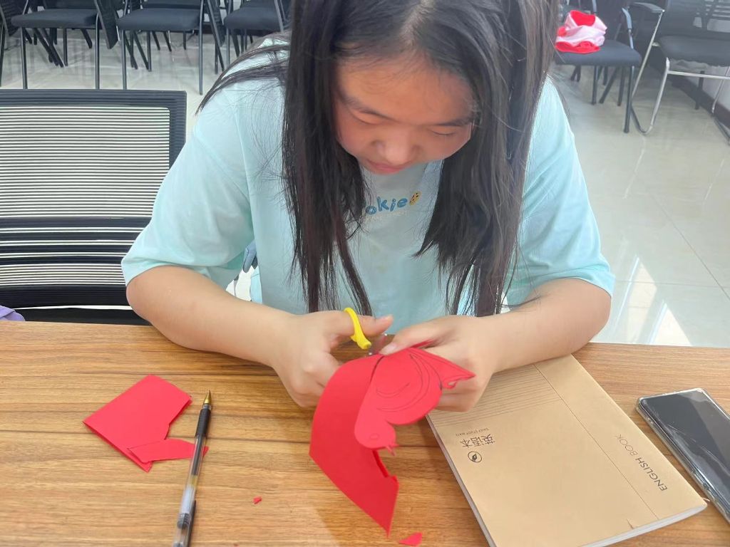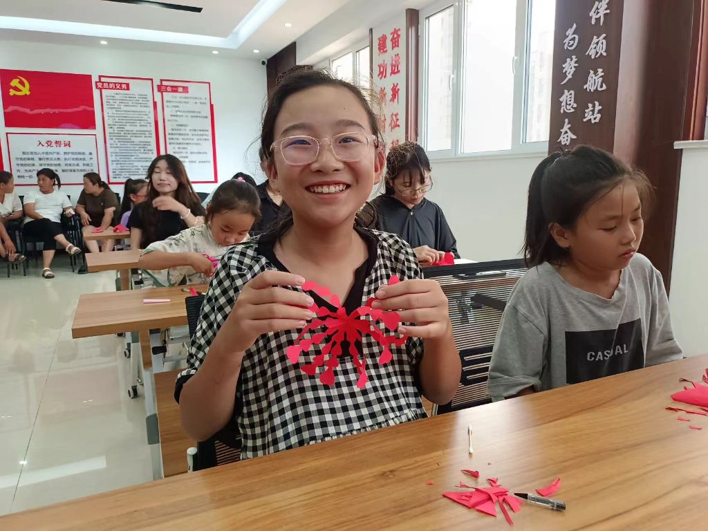 接下来,在社工的悉心指导下,孩子们纷纷拿起剪刀,全神贯注地投入到剪纸创作中。她们的手指灵活地舞动着,一张张红纸在大家的手中折折叠叠、剪剪刻刻,寥寥数下,徐徐展现。现场温馨融洽,笑声不断,大家通过剪纸展示、艺术交流,以实际行动激发对美好生活和忠贞爱情的追求和热爱。