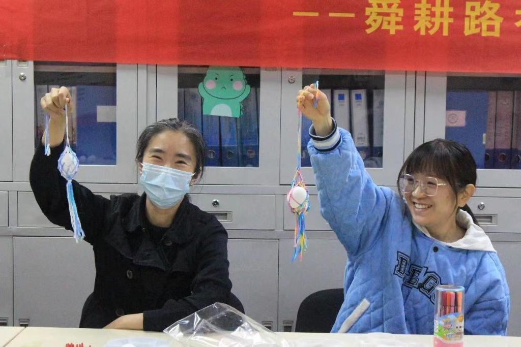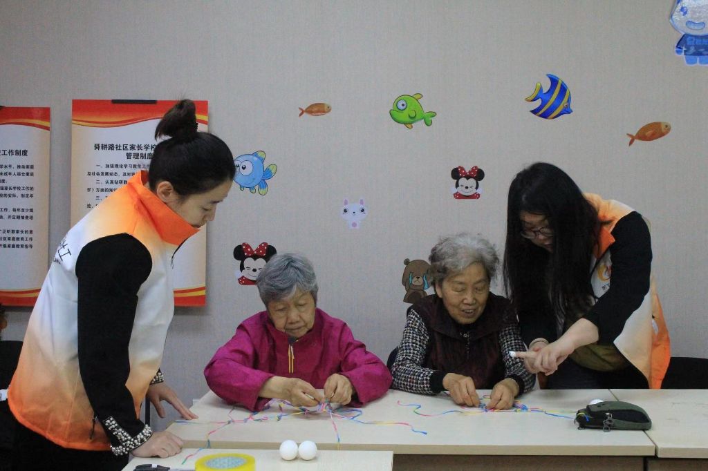 活动的第一环节是编蛋套与装饰鸡蛋同步进行的,居民可以自由选择编蛋套或者是装饰鸡蛋,活动现场大家可以自己选择要参与哪一个。在现场,大家都能够找到自己想要参加的活动。志愿者首先拿出准备好的材料,参与演示了如何进行蛋套的编制,在演示的过程中大家都认真地学习了编制蛋套的方法,就算有些并不明确的步骤也有现场工作人员进行指导。
