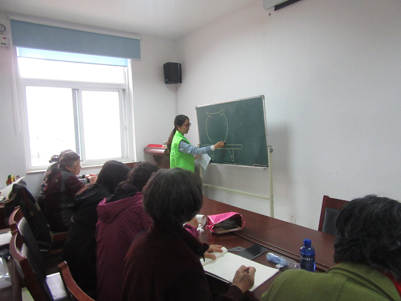 志愿者引导老年人签到并给各位老人上节课的作品加盖评定奖章,课堂开始后,志愿者向大家讲解了本节课要画的内容,并引导学员划分比例,方便构图。为了讲解的更加清楚明白,志愿者将猫头鹰和吊兰分解成若干小步骤进行教学。学员们一步步完整自己的作品,从起初勾勒出一个平面的图形到慢慢描摹,充实自己的作品使之逐渐立体。学员们在志愿者的引导下,掌握了着色的技巧,通过描边和着色,使作品更加逼真。