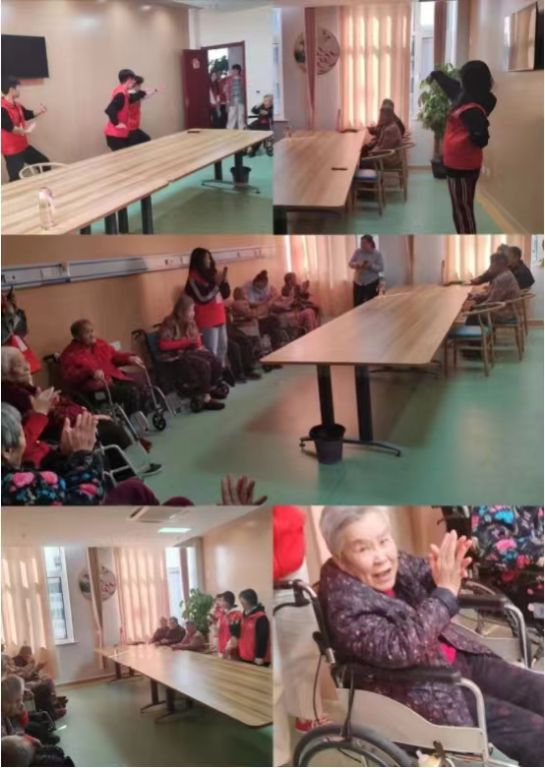 另一组志愿者则前往社区日间照料中心,为老人们带来了舞蹈、唱歌、打太极拳等精彩的节目,赢得满堂喝彩。据护工说李奶奶平时很少与人交流,这次活动她非常喜欢,还跟着哼唱了几句,打太极拳的时候还有几位爷爷奶奶坐着轮椅跟着模仿他们的动作。看着他们由内而发的表情流露,一张张憨态可掬的笑容,我们内心也感到满足,老有所乐,老有所安,大抵就是这个样子吧。