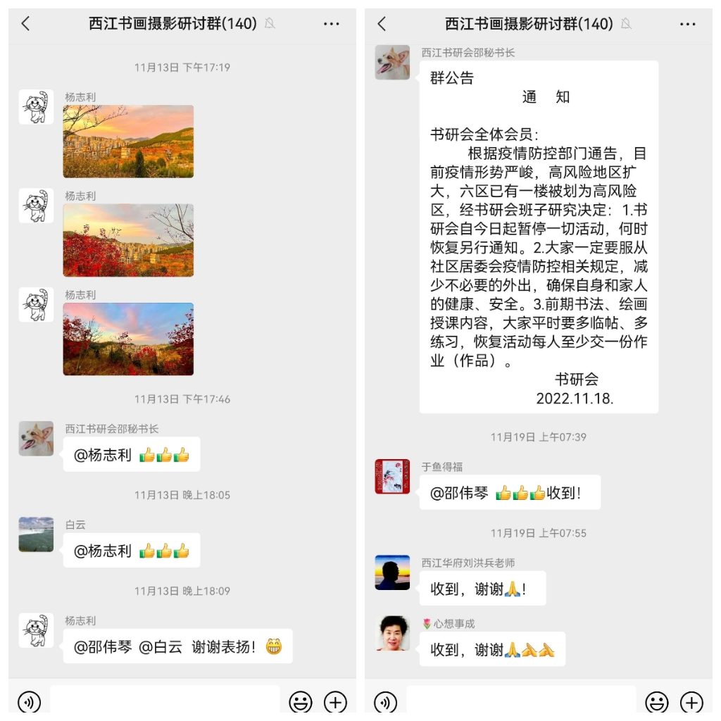 文化惠民生,服务零距离!西江书画摄影研究会作为社区社会组织的一个“缩影”,积极响应社区疫情防控要求,停止线下一切活动,呼吁全体会员和书画爱好者少出门、少聚集、少流动,鼓励会员朋友居家以静制动,多加练习磨练技能,适时开展线上个人展、团体展,丰富社区老年人的精神生活。同时,也积极准备“美好社区”提案大赛的提案申请书。
