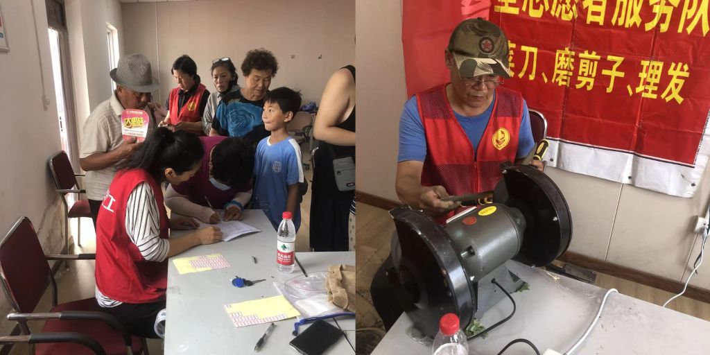 听到了磨刀师傅的吆喝声,居民纷纷把家中大大小小的剪刀、菜刀搬了出来,参与的居民络绎不绝,大家立即投入到紧张有序的工作中。社工和志愿者搭配合作,登记、贴标签、开刃、磨剪子、戗菜刀“一条龙服务”。