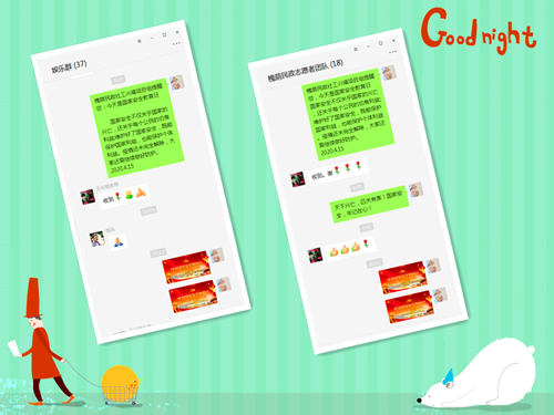 山泉驻槐荫社工兴福项目组积极响应国家号召,在微信交流群及微信公众号推送“全民国家安全教育日的来历”、“国家安全知多少”,重点大力宣传国家安全法规规定的关于公民维护祖国的安全、荣誉和利益的基本义务及网络安全法、国家安全法律等内容,引导社区居民学习国家安全知识及相关法律法规,有利于提高社区居民维护国家安全的法律意识,从而强化居民责任感,提高社区居民维护国家安全的能力。群内居民也积极互动,纷纷留言并转发由项目组制作的宣传海报,呼吁更多的居民谨记国家安全,牢记在心!