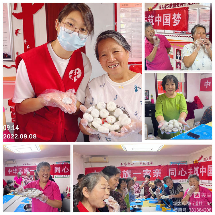 中秋节是中国重要的传统佳节,象征着阖家幸福团圆的吉祥之意,又称“团圆节”。月饼是中秋节必不可少的节日美食,吃月饼、赏圆月,是自古以来中秋节的传统庆祝方式。近日,为庆祝中秋佳节到来,大观园街道社工站在睦和苑社区、纬一路社区、万紫巷社区组织老年人和志愿者开展“邻里互助,情暖中秋”志愿主题活动,以此表达社工站社工对居民的美好祝福。