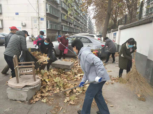 大家拿着扫帚、簸箕、垃圾袋等清扫工具分成几组,分别来到辖区内的单元楼前、路面上清扫落叶和垃圾。活动中工作人员、党员和志愿者积极发挥奉献精神,不怕脏、不怕苦、不怕累,个个奋力争先,认真清扫路面落叶,清理路面垃圾,经过两个小时的努力,使社区面貌焕然一新。
