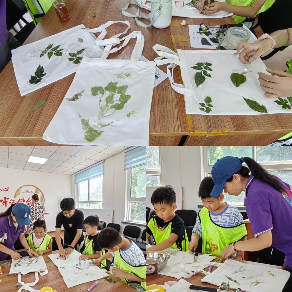 活动尾声,社工带领青少年们用捡到的各种杂草、落叶进行植物拓印。青少年们在社工的指导下,分别将饱含汁液的绿植置于帆布包之上,在软锤的敲击下将绿植色素、轮廓与纹路印染出来。随性的组合彰显出青少年的无穷创意。青少年们伴随着清脆的敲击声,将满满的收获刻入自己的作品之上。