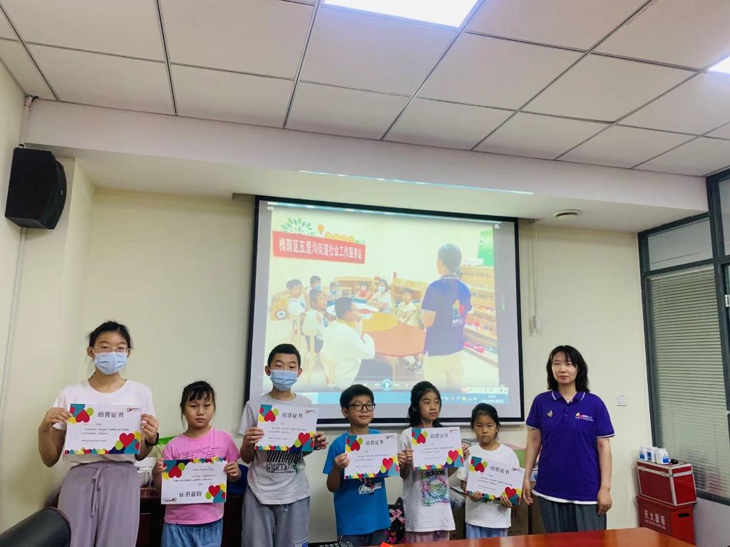 活动开始,社工站以短视频的形式带大家回顾了本次暑期夏令营精彩瞬间。音乐响起,小组成员通过视频唤起了很多关于暑期夏令营的美好回忆。接着,五里沟街道社工站站长李晓霞对本次夏令营活动进行总结并为小组成员颁发结营证书。