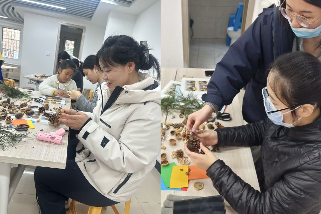 在手工创作环节,社工站创新采用“1+N”赋能模式:即由1名社工带领2名高校志愿者组成服务小组,为居民提供分层、逐级指导。既有面向老年群体的基础造型教学,也有针对青少年家庭的创意设计挑战。现场居民将核桃壳化作松鼠蓬松的尾巴,用开心果拼接出蛟龙的鳞甲。