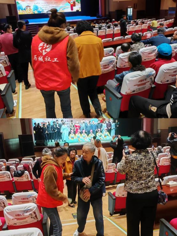 社工们早早来到活动现场,协助工作人员整理活动物品、引导老年人入座等。随着主持人的开场提醒声,活动在一曲充满活力的舞蹈中拉开帷幕,在男子独唱《咱老百姓》中,切实唱出了老百姓的勤劳朴实,现场老人们纷纷拍手叫好,本次汇演共有13个形式多样的节目,包括舞蹈、独唱、二胡演奏、唢呐演奏等,节目精彩纷呈,现场一个个精彩的节目也相继迎来现场老人们的阵阵掌声和喝彩声,整个演出大厅欢声笑语,爱意浓浓。活动结束后,一位奶奶对社工说:“你们这也怪不容易的,我知道今天有演出可以看,一大早吃了饭遛着弯就来了,今天的表演很不错。”