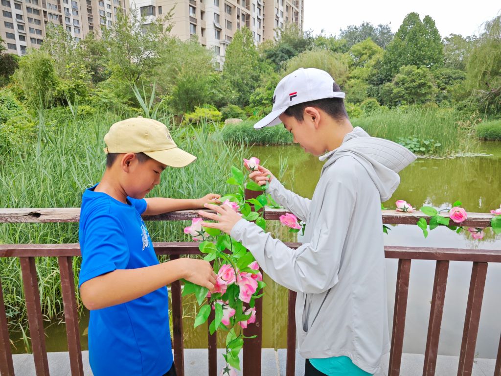 活动伊始,社工便明确了各组的任务分工。女生组以细腻的心思和丰富的想象力,承担起花坛绘画的重任,纷纷化身为小小艺术家,用丙烯颜料在花坛上绘制出了一幅幅生动的画面——从“彩虹小镇”的梦幻色彩,到“落日荷花”的宁静致远,每一个主题都充满了孩子们的奇思妙想;而男生组则以高效的协作能力,专注于栏杆的装饰工作——花藤缠绕栏杆间,仿佛春日提前降临,绚烂而不失雅致,为社区添上了一抹生机勃勃的绿意与温馨。他们不仅在创作中享受到了艺术的乐趣,更在无形中接受了艺术的启蒙教育。在整个过程中,孩子们展现了非凡的团队合作能力,无论是女生组间的创意碰撞,还是男生组的高效协作,都让人印象深刻。他们相互支持,共同进步,共同完成了这次任务。